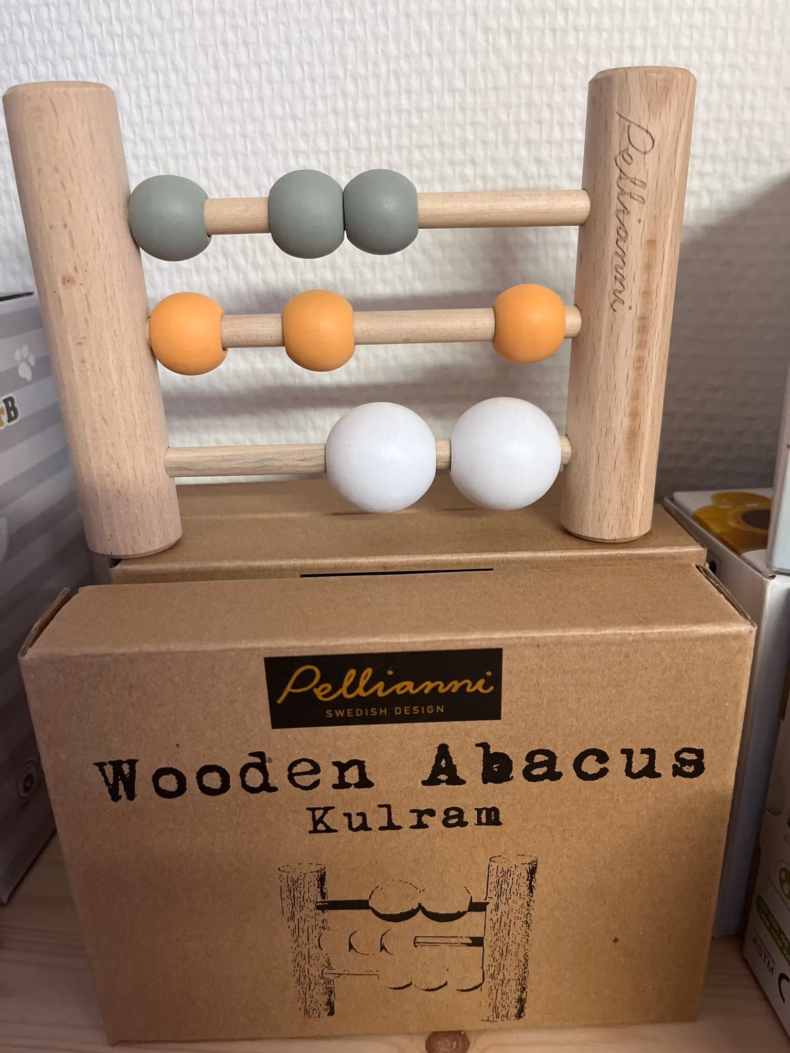 Detta är en Pellianni mini-kulram i trä. Tillverkad av FSC-certifierat björk- och bokträ. Den har tre rader med kulor i pastellfärger. Designad f
