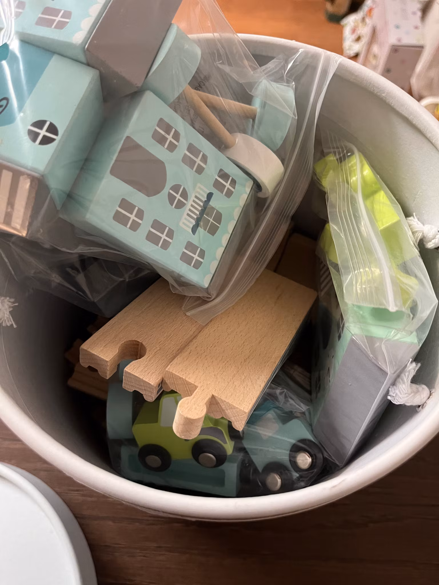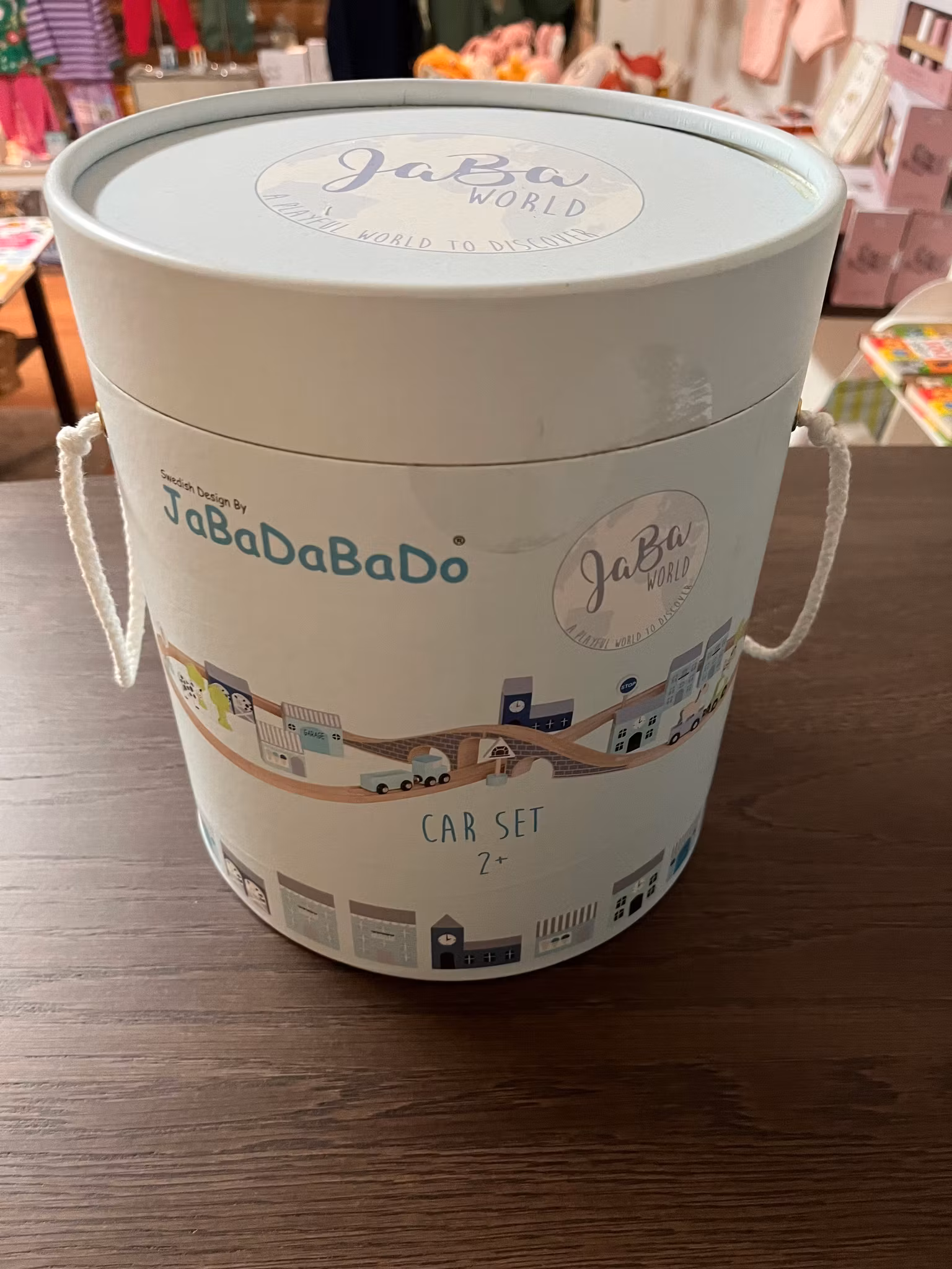 En jättefin trätågbana med många tillbehör från Jabadabadoo