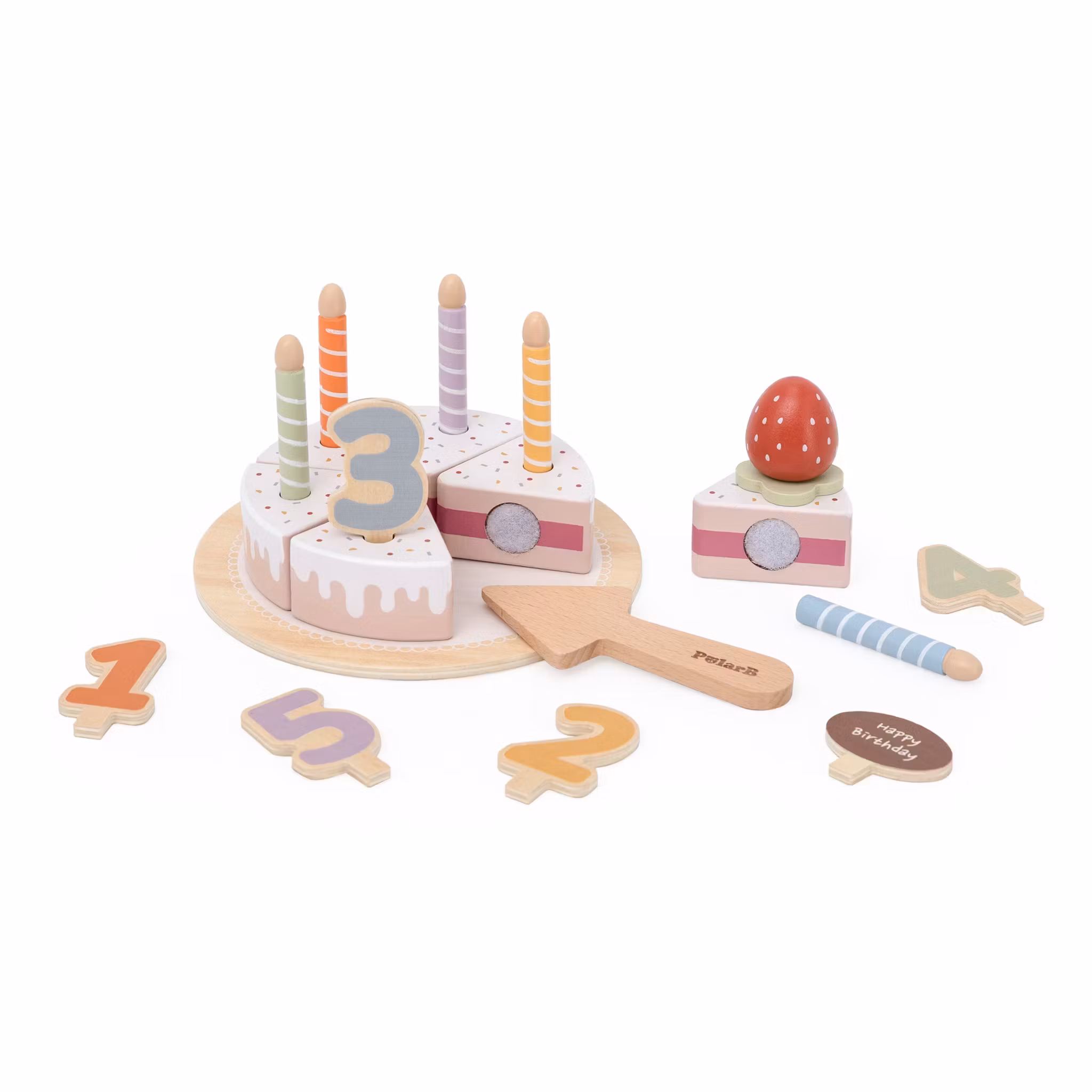 Vacker trätårta i fina färger med många tillbehör såsom ljus och siffror